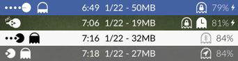 This theme changes many of the iOS 7 status bar images. Pac-Man eats the carrier dots, Blinky fills up for Wifi, and other icons, such as the orientation lock.