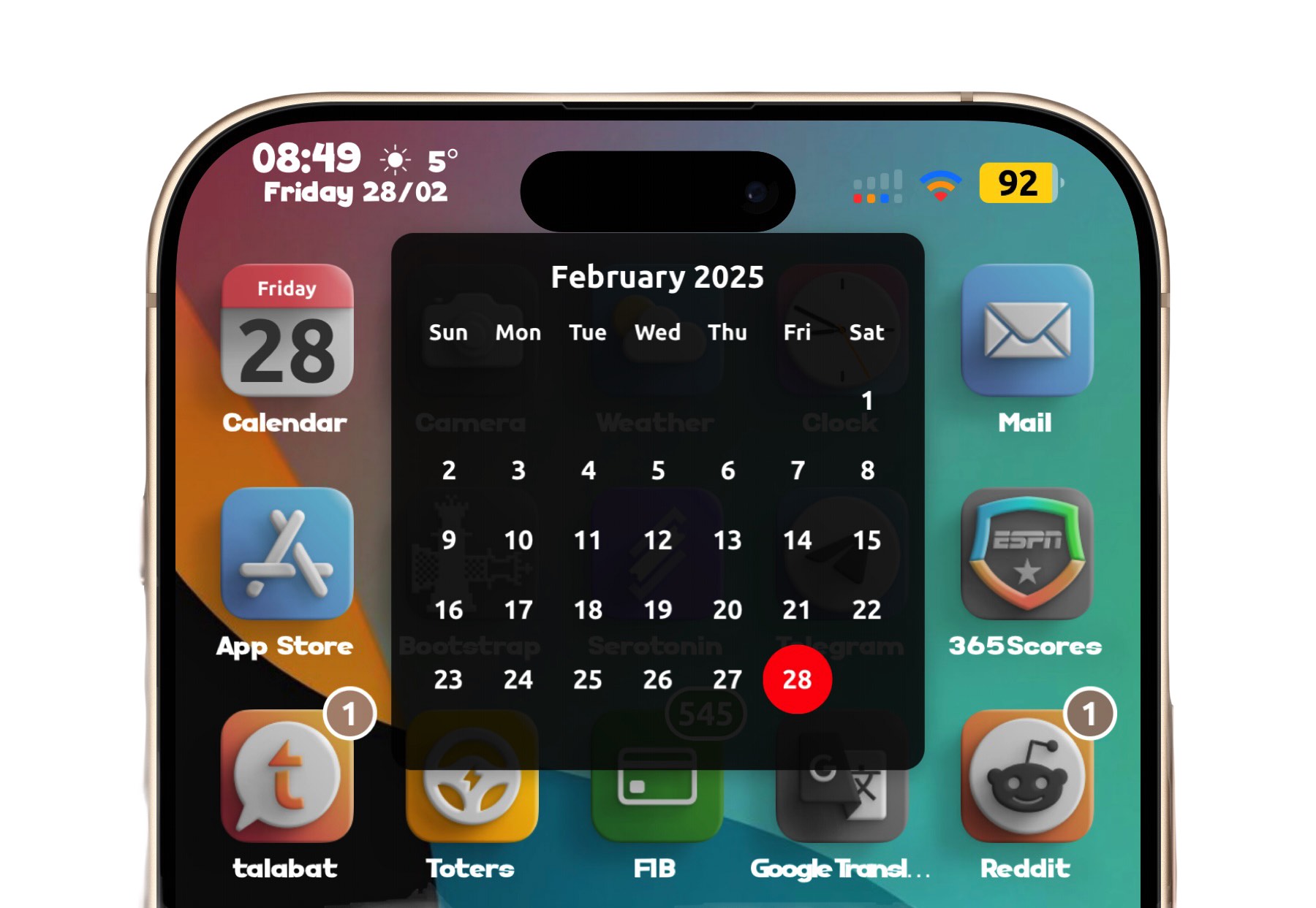 Tap on time to open calendar window will show you this month days full calendar and with another kind of tap you can open alarm window will show you your alarm time and the time to alarm activate and you can change these windows X and Y and fonts sizes and can choose between two kind of tapes.