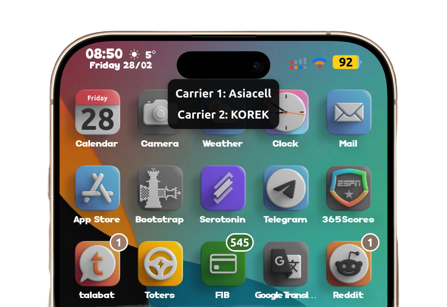 Double tap on carrier bars to open window showing carrier name for single sim or double and you can change window font size and X,Y of it and window background alpha.