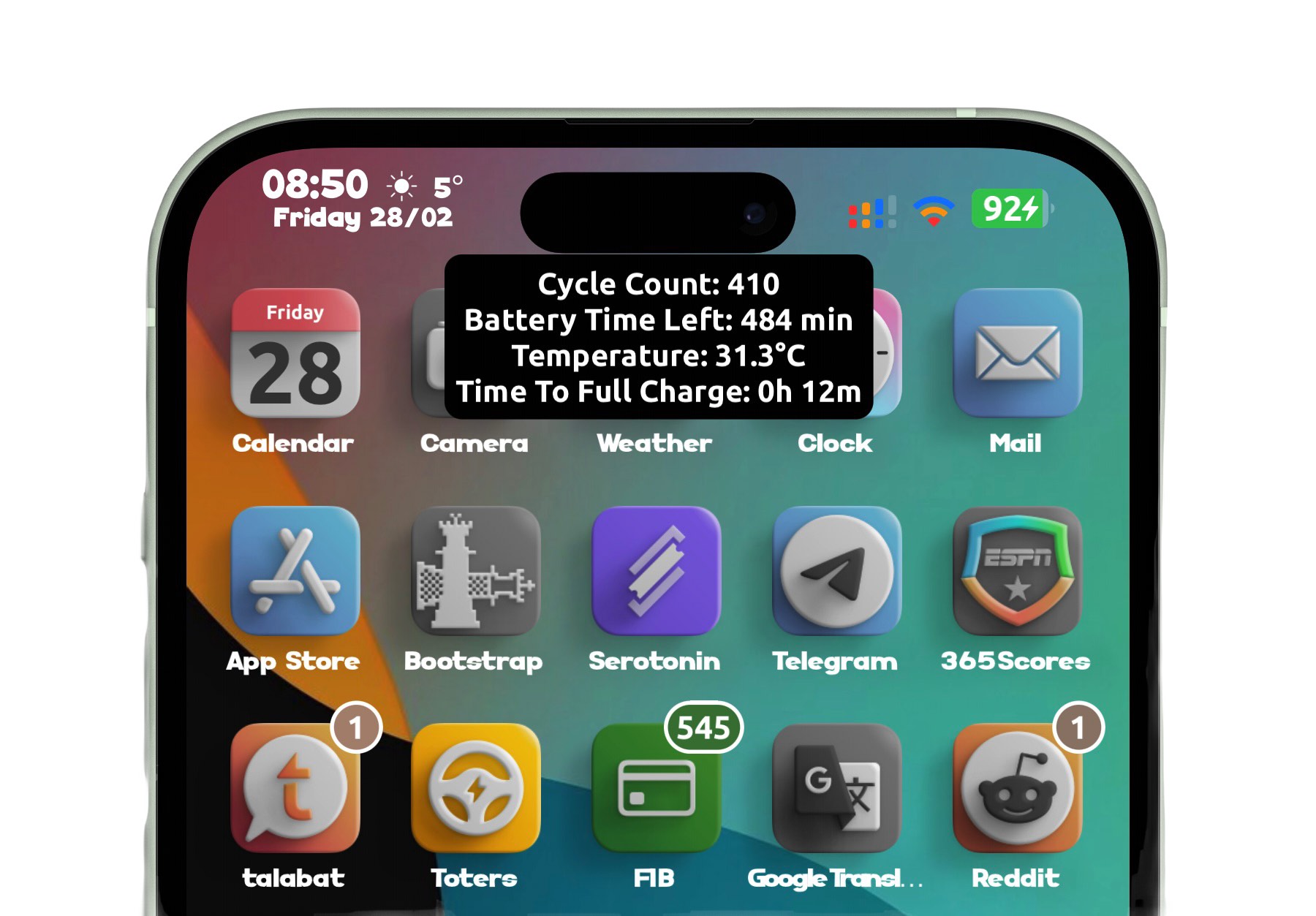 Hold tap on battery to show battery information window showing battery cycle count and battery time left and battery temperature and when you on charging it will add showing time till full charge and you can change window alpha.